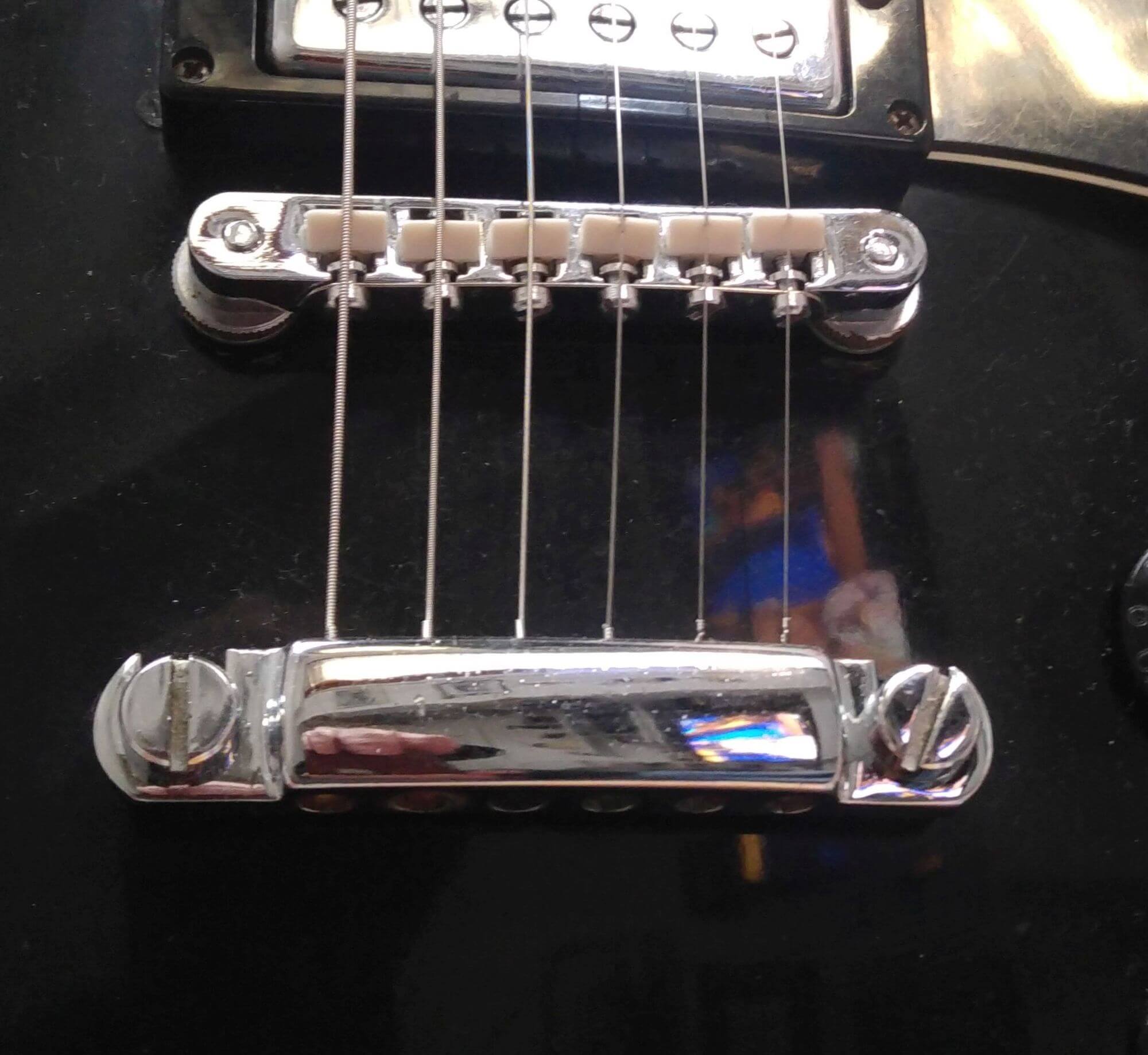 Per quanto riguarda il ponte anche esso è cromato e si regola con la classica scomodità della Les Paul. Come accennato nella sezione precedente è stato necessario alzare l’action al fine di permettere la vibrazione delle corde a causa dell’elevata altezza della cornice del pickup al ponte.