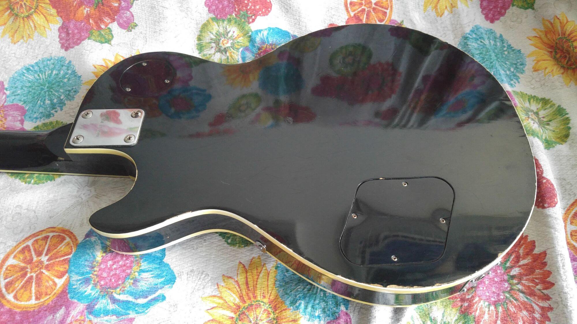 Passiamo ora alla descrizione del body e del manico della Cimar No.1904. Aprendo il vano elettronica abbiamo potuto constatare che il body è in multistrato e non legno massello in quanto si notano benissimo i vari strati che lo compongono. Questa scelta era molto comune nelle chitarre economiche negli anni 70 e 80. La forma del body è quella classica della Gibson Les Paul, riprodotta in maniera abbastanza fedele. Sul corpo è presente il classico battipenna a tre strati che ha più una valenza estetica rispetto ad utilità. Il corpo è alto 17 1/2” e largo 13″.